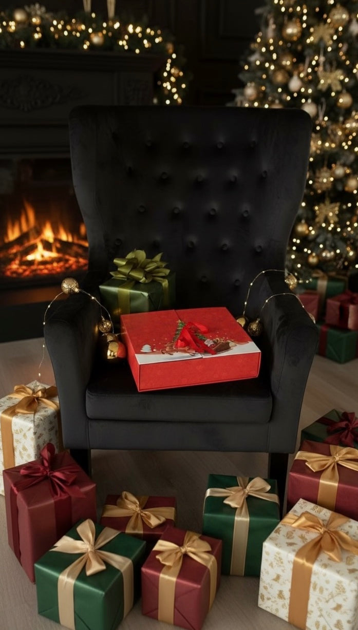 Sarkans Ziemassvētku skaistumkopšanas adventes kalendārs ar 24 numurētām kastītēm un svētku dizainu, daļa no Beauté Magasin 2025 kolekcijas.