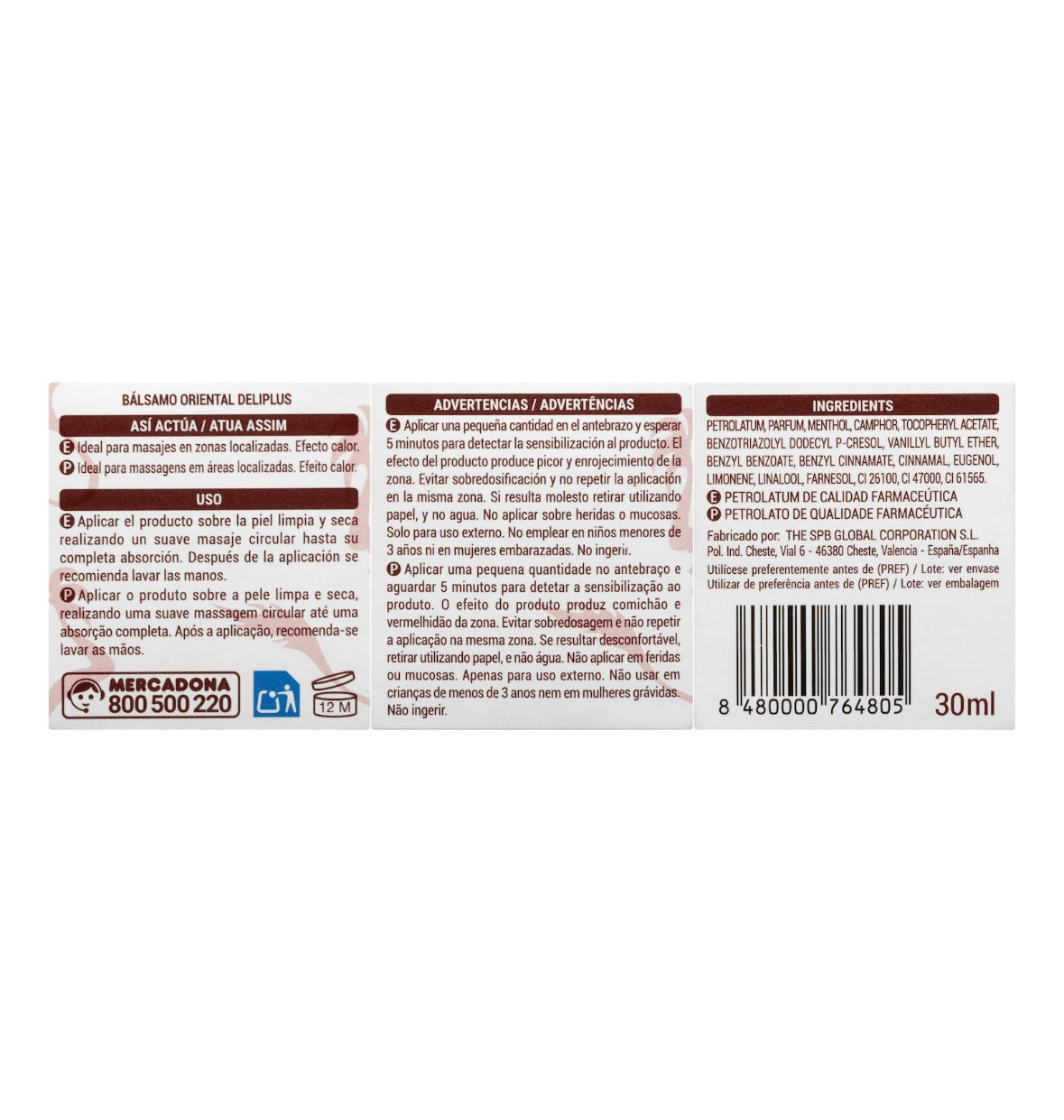 Классический согревающий бальзам, вдохновленный традиционными восточными средствами. Deliplus Bálsamo Oriental — это многофункциональный бальзам для наружного применения, содержащий смесь активных ингредиентов, включая камфору, тимол, ментол и эвкалиптол, известные своими успокаивающими и согревающими свойствами.